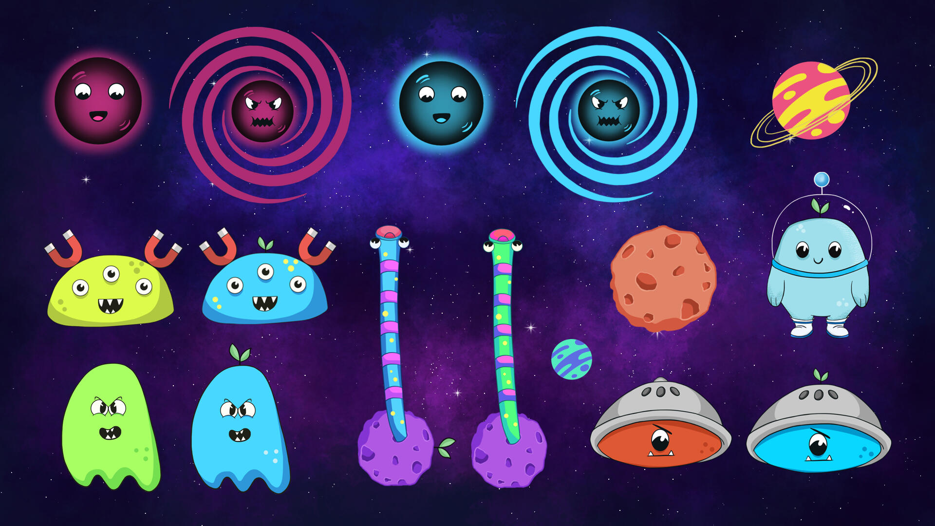 Cada personagem tinha 2 versões (jogador e inimigo), diferenciadas pela cor e/ou por um elemento visual, como uma folha.