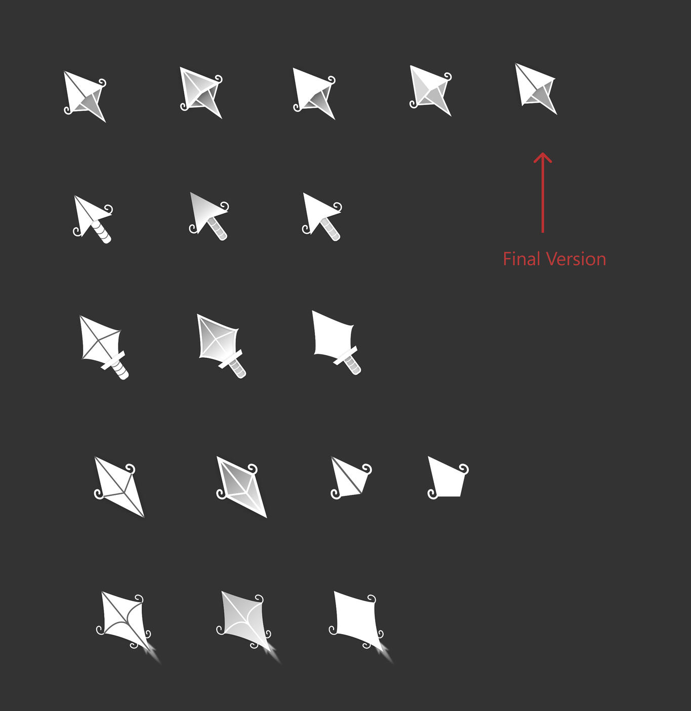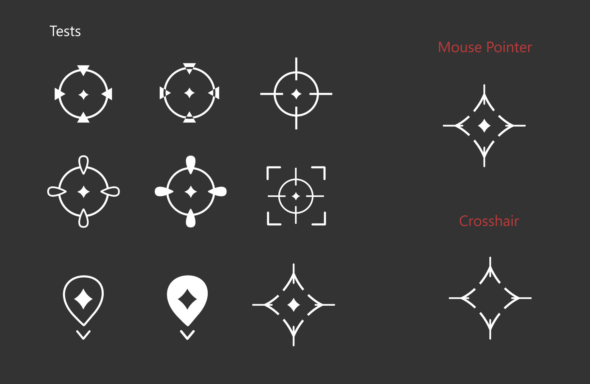 Foram criadas várias versões de teste para o cursor, com o objetivo de encontrar a opção mais intuitiva e visualmente adequada ao estilo do jogo.