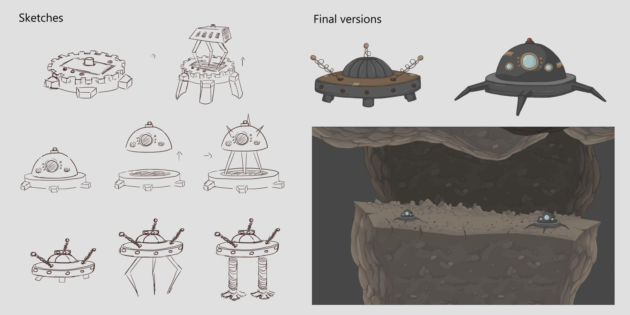 Aqui apresento o processo de design de várias armadilhas criadas para o jogo. A partir de esboços iniciais, explorei diferentes ideias para mecanismos desafiantes e imersivos. Os designs finais foram ajustados para se integrarem tanto na estética como na jogabilidade do jogo, com inspiração no estilo steampunk. Tive também em conta o cenário e o design dos níveis onde as armadilhas seriam inseridas, garantindo que se destacassem de forma eficaz e harmoniosa no ambiente, sem perder clareza visual nem impacto.